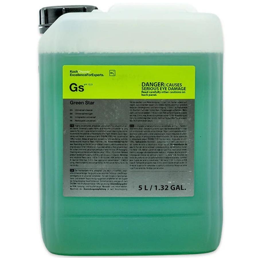 Koch-Chemie Green Star (GS) е силно концентриран алкален универсален почистващ препарат (APC), използван основно за авто детайлинг и индустриално почистване. Той е без фосфати и разтворители и има pH около 12.5, което му позволява да разгражда силни замърсявания, масла и мазнини.